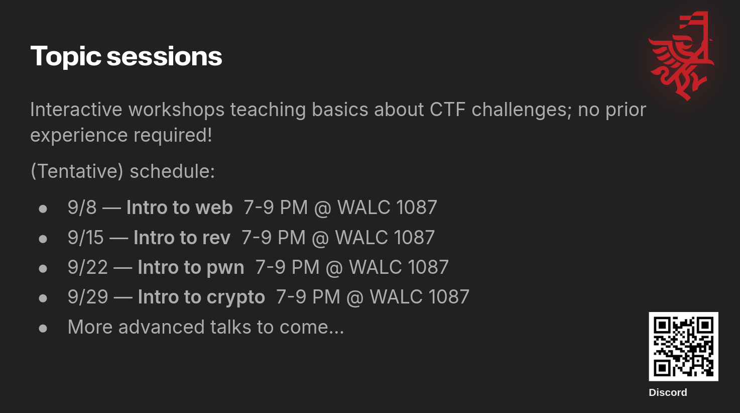 After we finish teaching the topic sessions, we will host a Bootcamp CTF where everyone can test the skills they have learned! The Bootcamp CTF has challenges for all difficulty levels, and it will be hosted on October 5th from 12pm - 7pm.